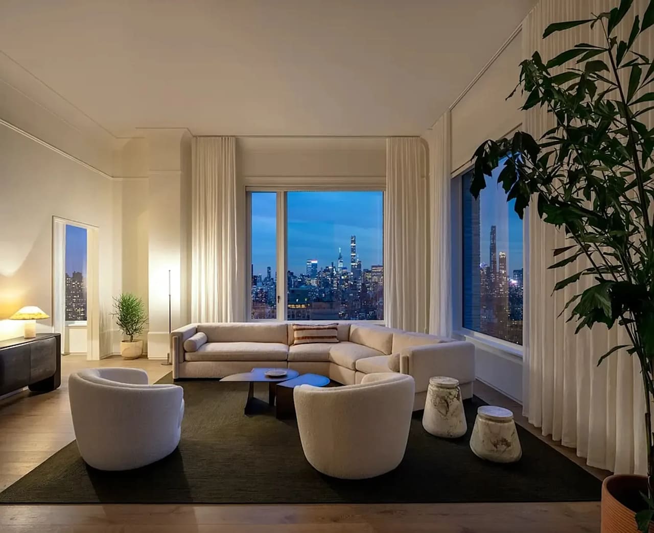The 524-foot skyscraper at 180 East 88th Street, designed by DDG, ranks not only among the Upper East Side’s tallest apartment buildings, but also the most refined. Custom Kolumba brick from Denmark creates a tactile, textured façade. A recessed entrance leads through a garden to a cavern-like, vaulted lobby that echoes the building’s distinctive arched aesthetic. Undulating plaster molding by artist Jaan Hooss decorates the wall above the lobby fireplace. Vibrant murals by painter Sean Murtha animate the children’s playroom. The fitness center comes with a basketball half-court that overlooks a cozy courtyard. Full- and half-floor apartments boast 14-foot ceilings and panoramic views in all directions. The arched terrace at the penthouse duplex showcases Central Park in all its verdant glory.
