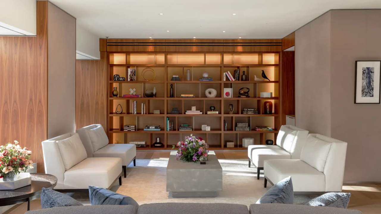 The spacious 4-bedroom, 4.5-bathroom apartment spans the entire 41st floor, featuring an open-plan living room, dining room, and kitchen with high ceilings and a fireplace.