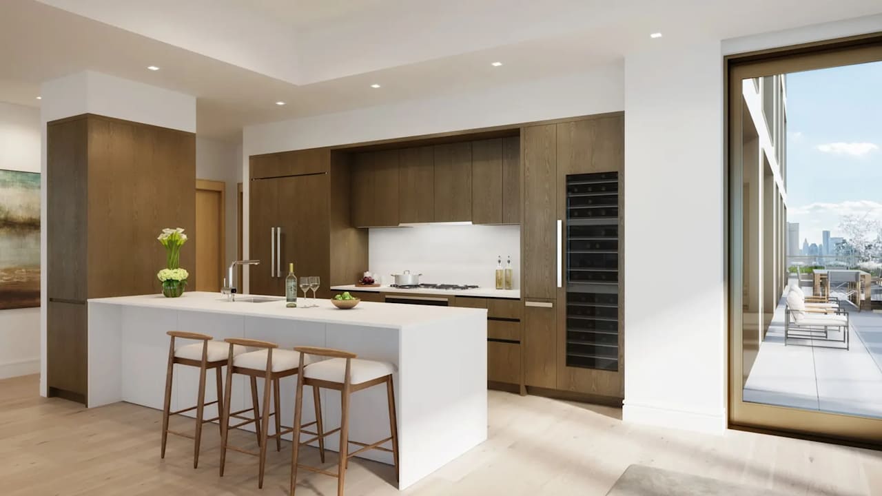 The 1,464 square foot home features over 8’ tall bronze windows, 7 wide plank oak flooring, a large Poliform kitchen designed by Champalimaud with luxury Miele appliances, and each bedroom has an en-suite bath with radiant heat flooring.