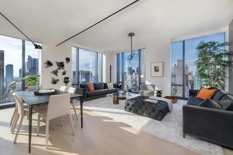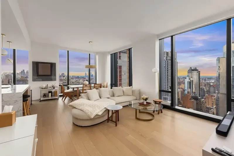 Designed by Rafael Vinoly and featuring interiors by Jeffrey Beers International, Residence 34C offers 1,397 square feet of refined living space. This corner split two-bedroom home boasts southwest exposures with sweeping views of the Hudson River, One World Trade Center, and the downtown Manhattan skyline.