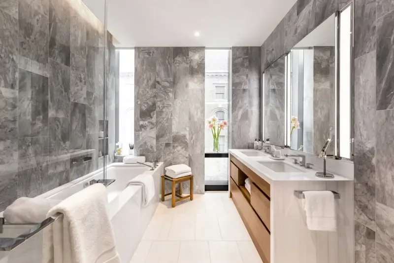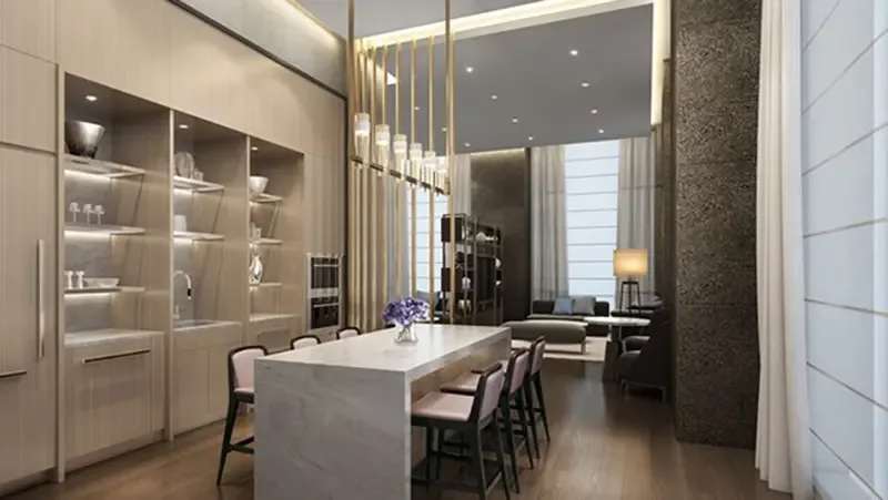 A light-filled suite of amenities, designed by Jeffrey Beers International, spans two floors and offers residents carefully curated spaces for relaxation, socializing, and recreation with a lobby library featuring a double-height bookcase wall, an entertainment suite featuring a bar and private dining room with catering pantry, a fitness club opening onto the furnished Fifth Avenue Terrace, a games lounge, and a kids' club.