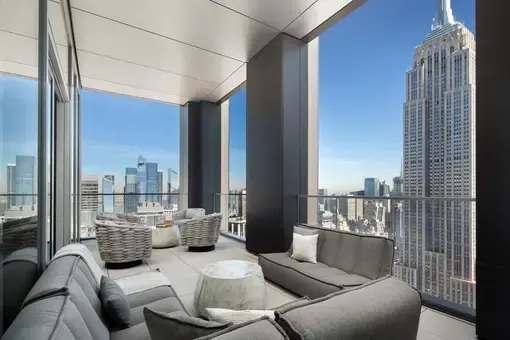 Panoramic Manhattan skyline views from four exposures coupled with floor-to-ceiling windows, colossal Great Room, soaring ceilings, expansive Loggias and superior finishes make this dramatic NoMad Trophy Penthouse the Best in Class. From One World Trade to the waterways of the Hudson and East Rivers, from Madison Square Park to Central Park, from the bridges of the East River, to world-famous New York City landmark buildings including the Chrysler Building, the New York Life Building, the Flatiron Building, the Woolworth Building and the most astonishing view of the Empire State Building, there is no better viewpoint to see the Manhattan skyline come to life from sunrise to sunset than in the award-winning 277 Fifth Avenue, Penthouse54. Features include: Soaring ceilings Landscaped Loggias encompassing the entire North exposure of the penthouse Floor-to-ceiling windows framing the Manhattan skyline North, South, East and West South-West corner double Great Room with art opportunity walls Separate Dining Room with sliding door to Loggia for the ultimate in indoor/outdoor entertaining High-end Eat-in Kitchen with both Breakfast Bar and dining table plus access to planting Loggia Custom Kitchen includes white oak-cabinetry, marble counters and fully integrated Miele appliances, dishwashers, full-size wine refrigerator 6-burner gas stove top, electric oven, microwave convection oven and large island 4 Bedrooms with en-suite Bath plus Powder Room Primary Wing with East River views includes principal Bedroom with lounging Loggia, Dressing Room, additional Closet, 5-fixture windowed Spa Bath and corner Office or 4th Bedroom with en-suite Bath 2 additional Bedrooms with sweeping Southern views of downtown Manhattan’s breathtaking skyline Secondary Mudroom entrance with side-by-side Laundry and hall leading to the Kitchen area The building, designed by starchitect, Rafael Viñoly Architects with interiors by Jeffrey Beers Interiors, is graced with oversized windows complemented by warm woods and elegant natural stones.