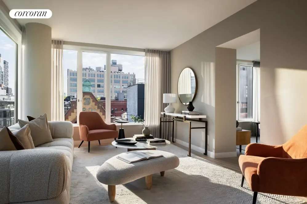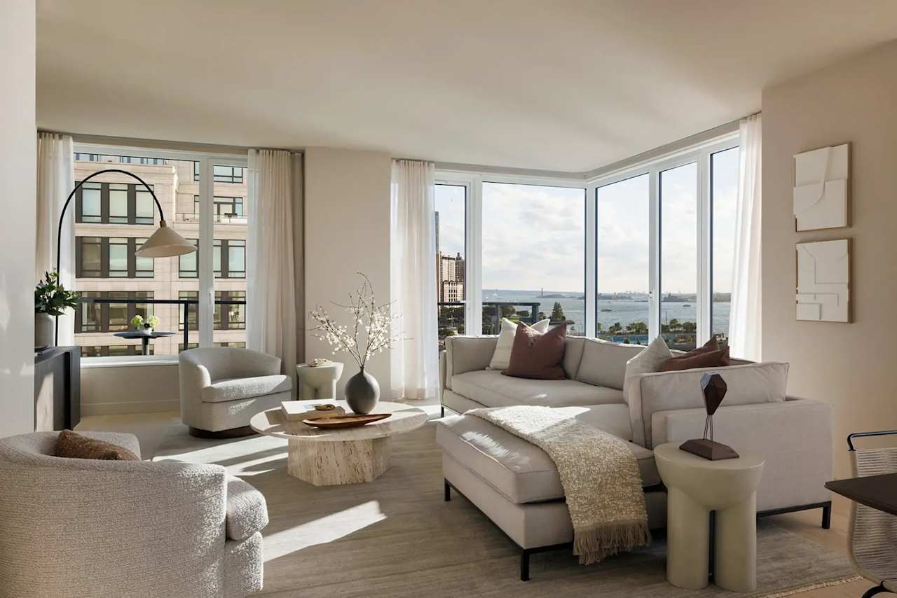 The apartment boasts modern interiors with 7-inch-wide plank white oak flooring, bronze-finished windows, an open-concept kitchen with Miele appliances, quartzite countertops, and matte white lacquer cabinetry, and bathrooms featuring European White Oak cabinetry, Calacatta Lincoln marble countertops, and Dornbracht fixtures.