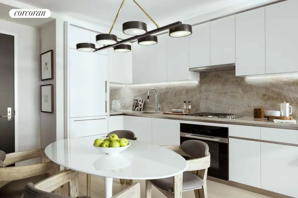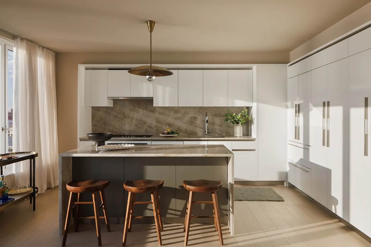Open-concept kitchens feature Miele appliances, natural warm-toned quartzite countertops, crisp matte white lacquer cabinetry, architectural cove lighting and Dornbracht faucet fixtures. Bathrooms are clad in handsome honey-toned European White Oak cabinetry, Calacatta Lincoln marble countertops with undermounted sinks, and showers with Dornbracht fixtures.