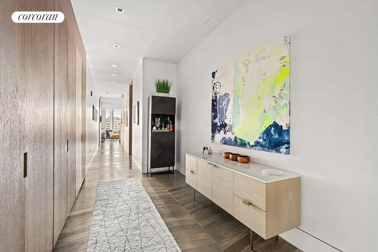 Designed by the esteemed Gabellini Sheppard, renowned for their luxe minimalism, this home welcomes you with an oversized entry into a spacious foyer fitted with custom closets-a distinctive feature in New York City living.