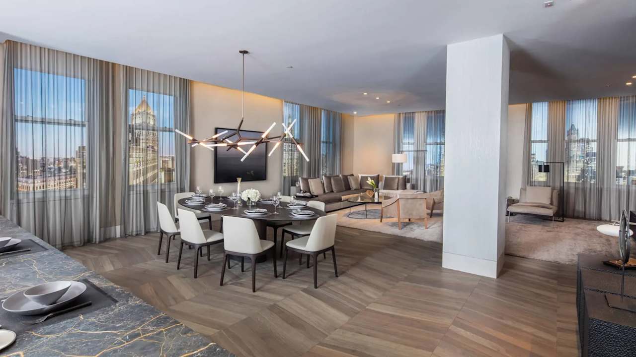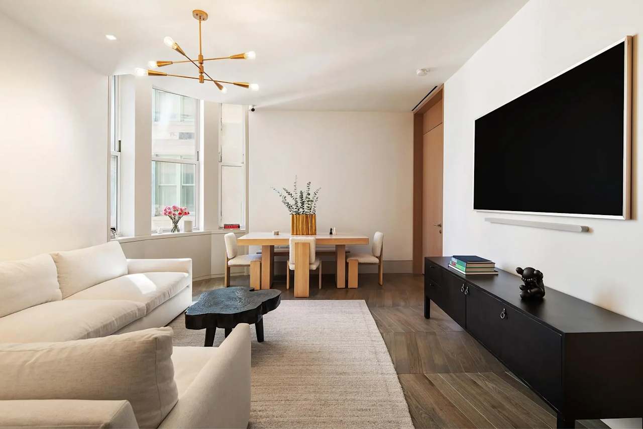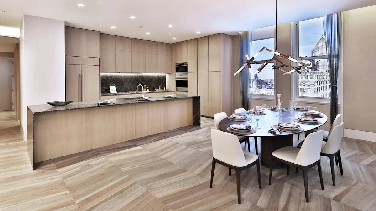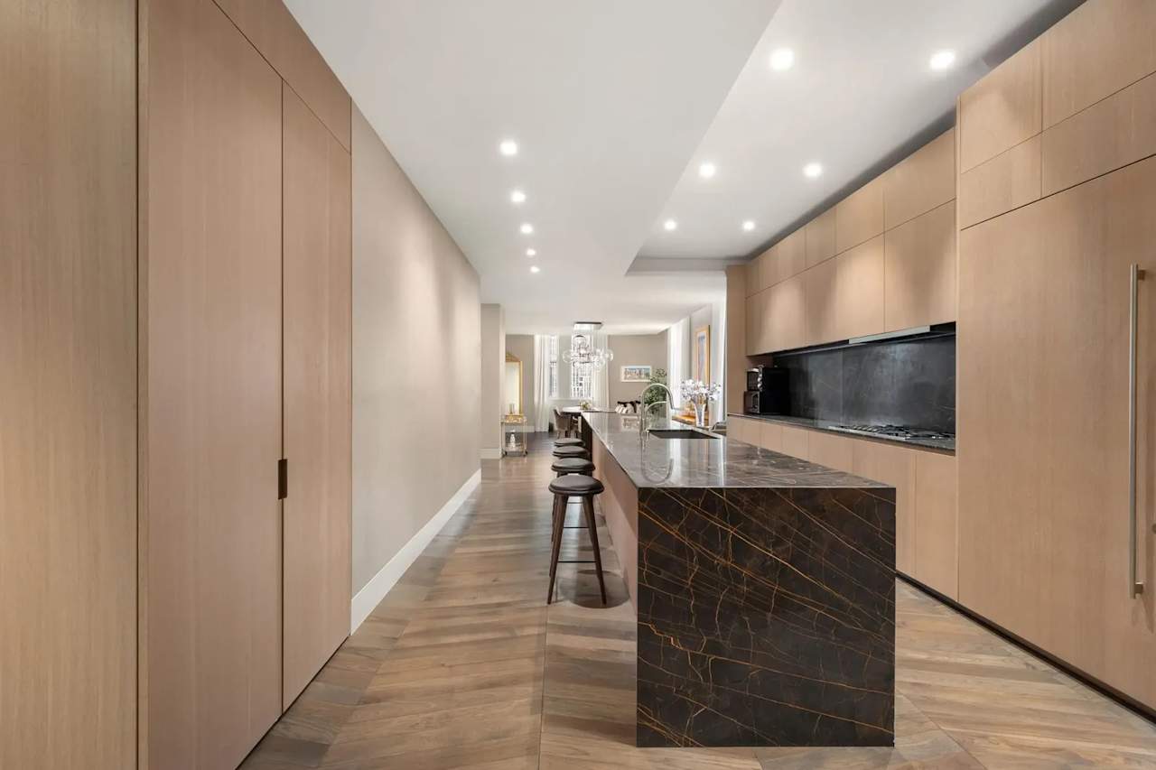 The residence spans two floors, featuring an expansive living and dining area with abundant natural light and iconic New York City views, a chef’s kitchen with custom ceruse Cypress wood cabinetry and top-of-the-line appliances, and hickory hardwood floors in a custom chevron pattern throughout.