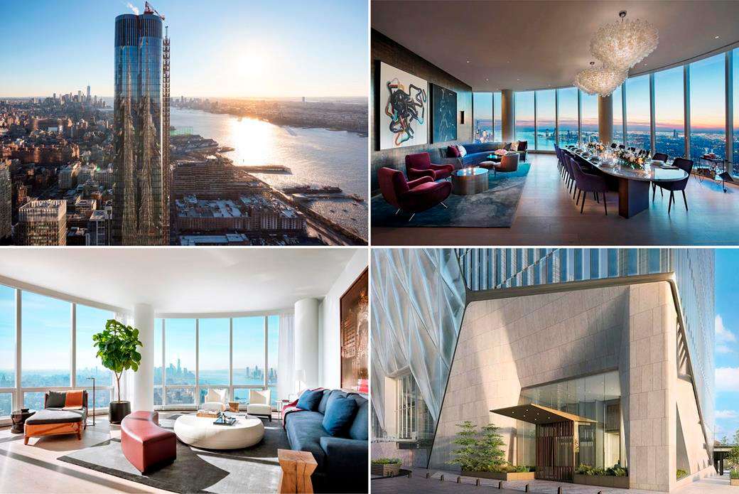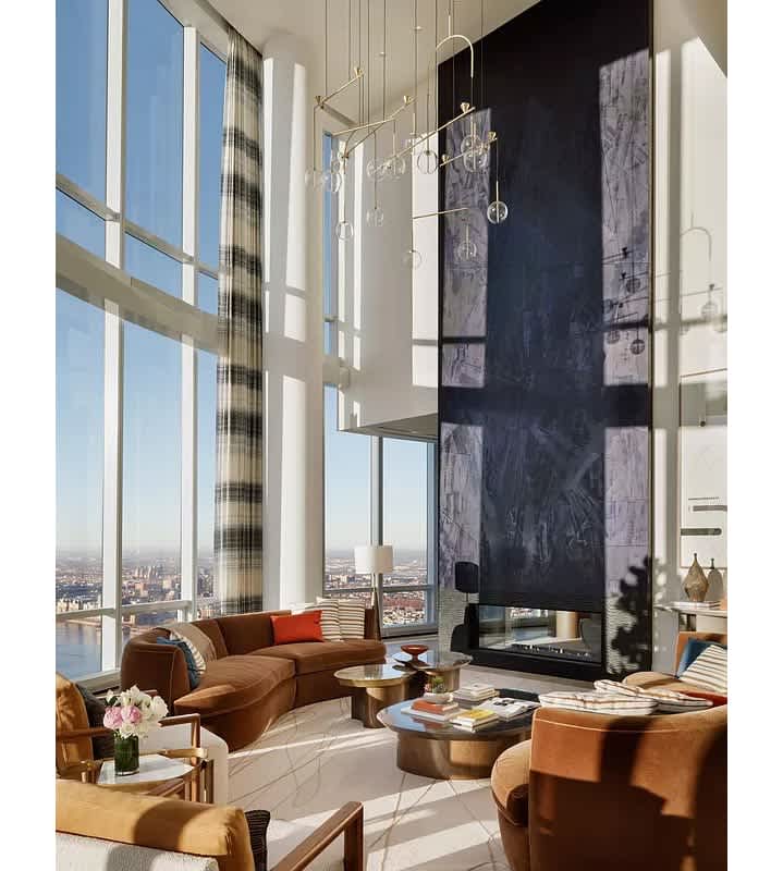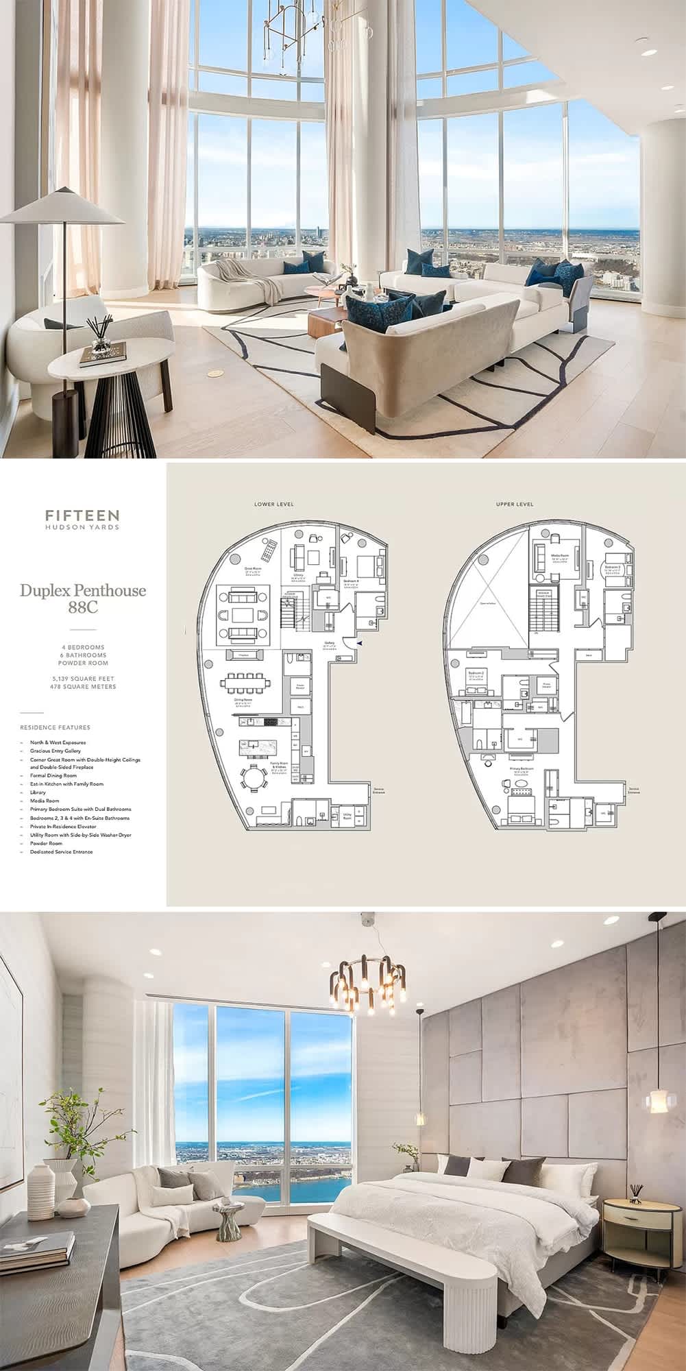 Penthouse #88D is a 5,139-square-foot residence offering stunning panoramic views of the NYC skyline and the Hudson River. It features a double-height living room with a double-sided fireplace, a Bulthaup kitchen, and a private internal elevator. The 88th floor features a spacious great room, dining area, library/guest suite, kitchen, casual den, and service entrance. The 89th floor has three additional bedroom suites, including a primary suite with dual baths and two dressing rooms. An elegant entry foyer, utility room, and powder room complete this exceptional home.