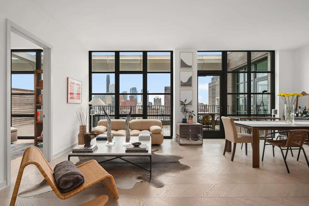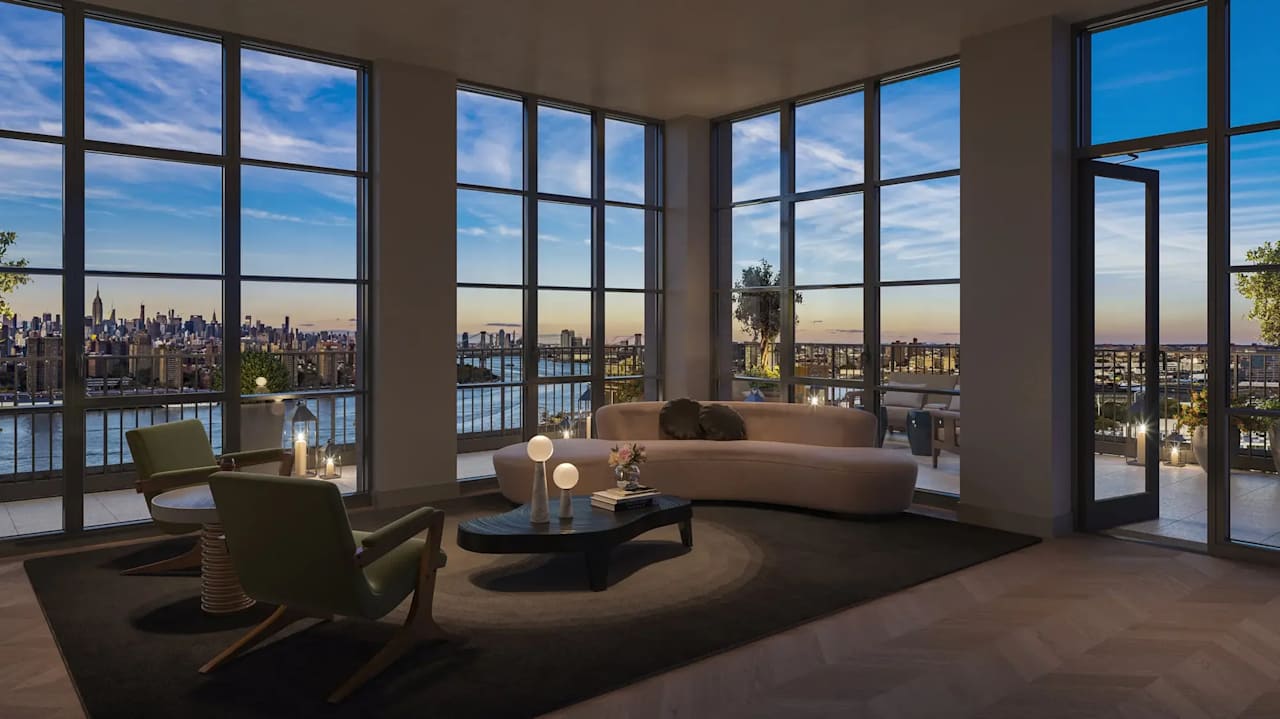 Residences feature approximately 10-foot ceilings, chevron-patterned white oak flooring, custom-designed chef’s kitchens equipped with Gaggenau appliances, and master bathrooms with custom Waterworks and Morris Adjmi-designed fixtures. Immense divided light windows frame picture-perfect views of the Lower Manhattan and Brooklyn skylines.