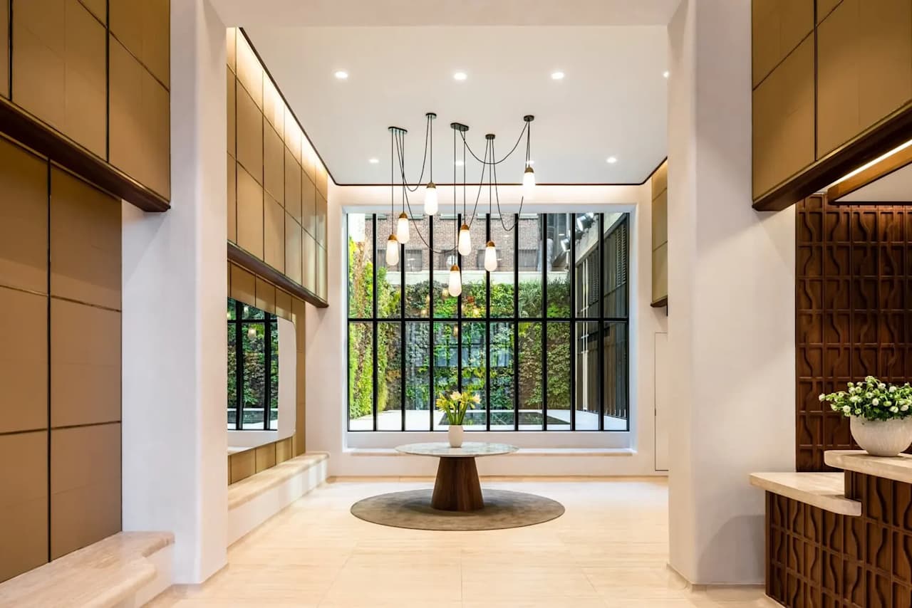 The 27-story masonry building draws inspiration from 20th century French industrial design, and its historic pedigree continues down tree-lined Charlton Street through the nearby cobbled streets of Soho, Tribeca, and the West Village.