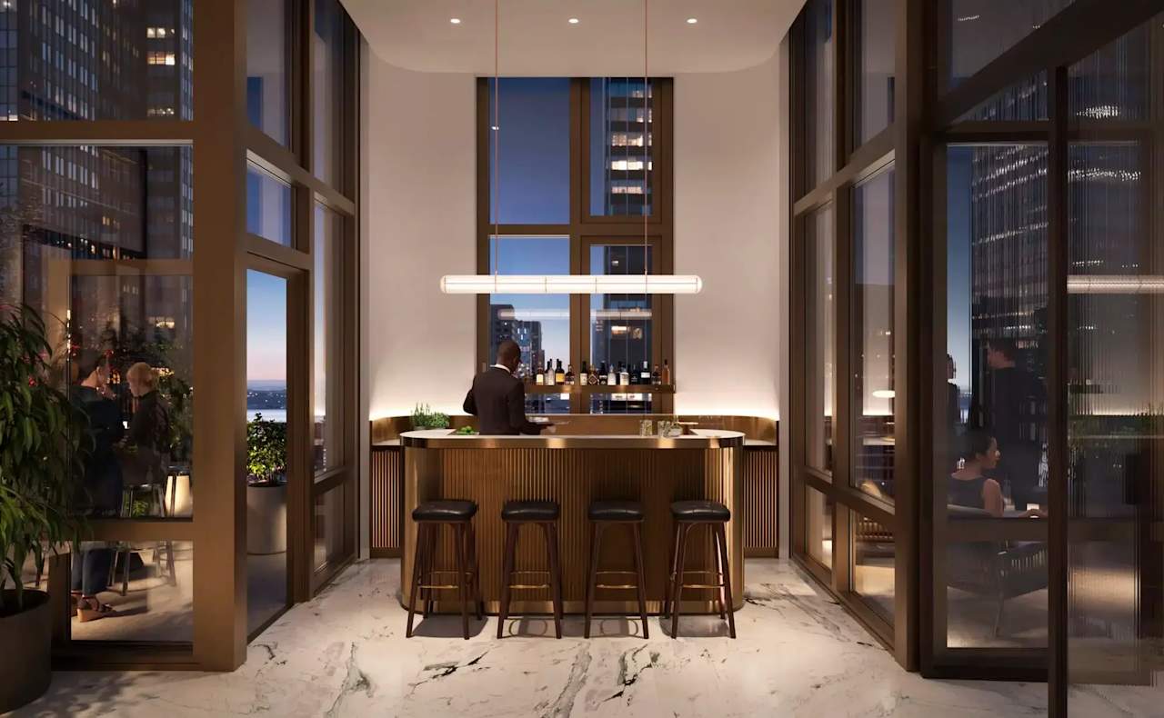 The building provides a welcoming lobby with full-time concierge services, including travel arrangements, event management, private chef and catering coordination, and event tickets and reservations. Health and wellness offerings encompass a fitness center, a separate movement/meditation studio, and in-house spa services. Finally, the Crest Club on the 35th floor offers a reading room with a fireplace, a private dining room with a catering kitchen, an intimate bar, and outdoor terraces, all enhanced by breathtaking skyline views.