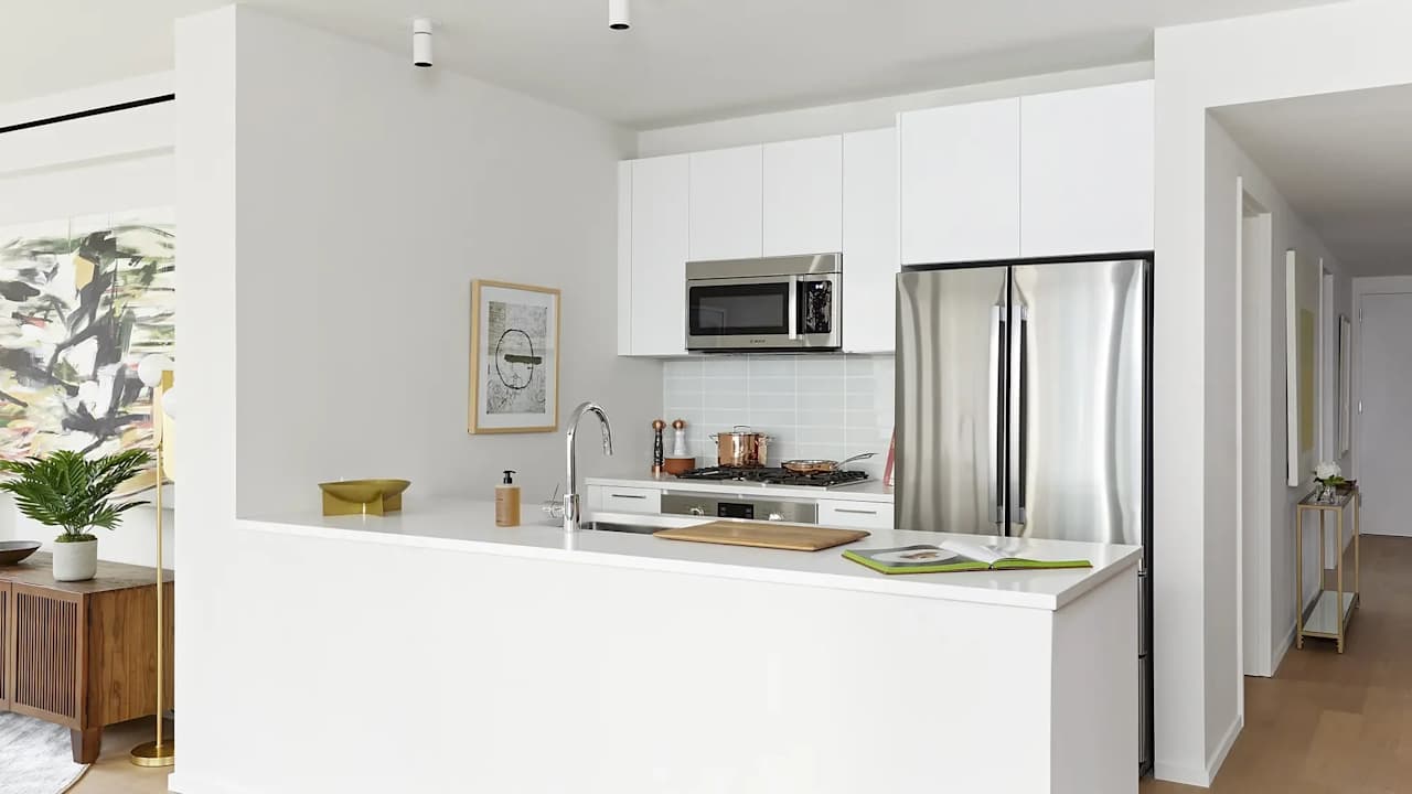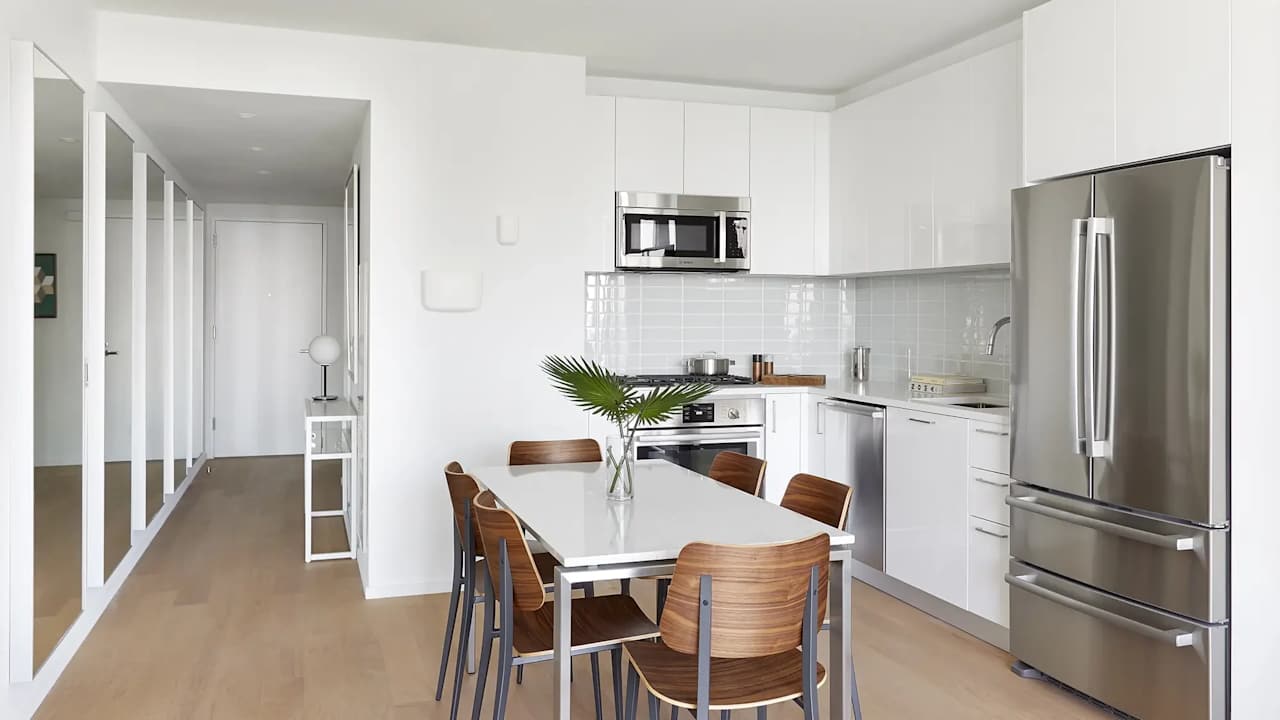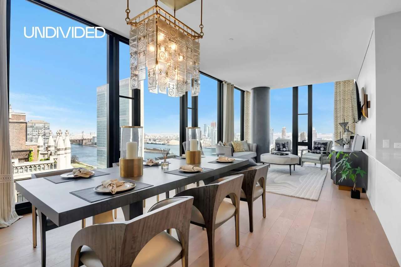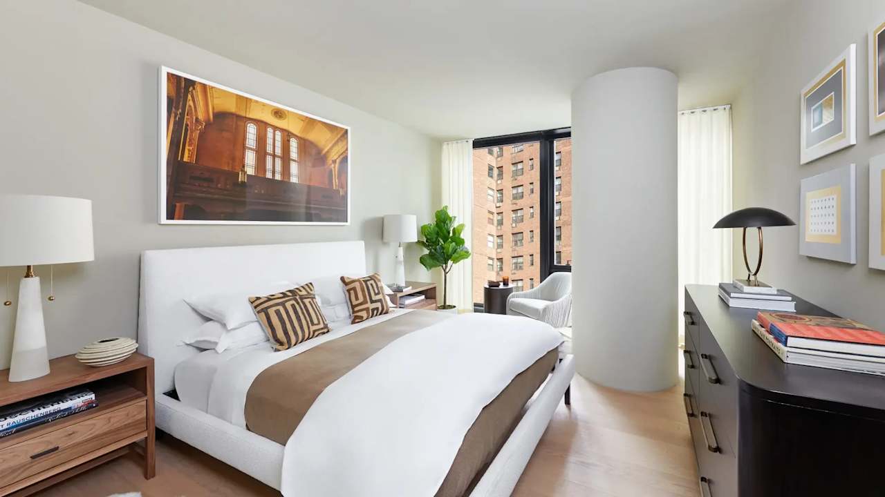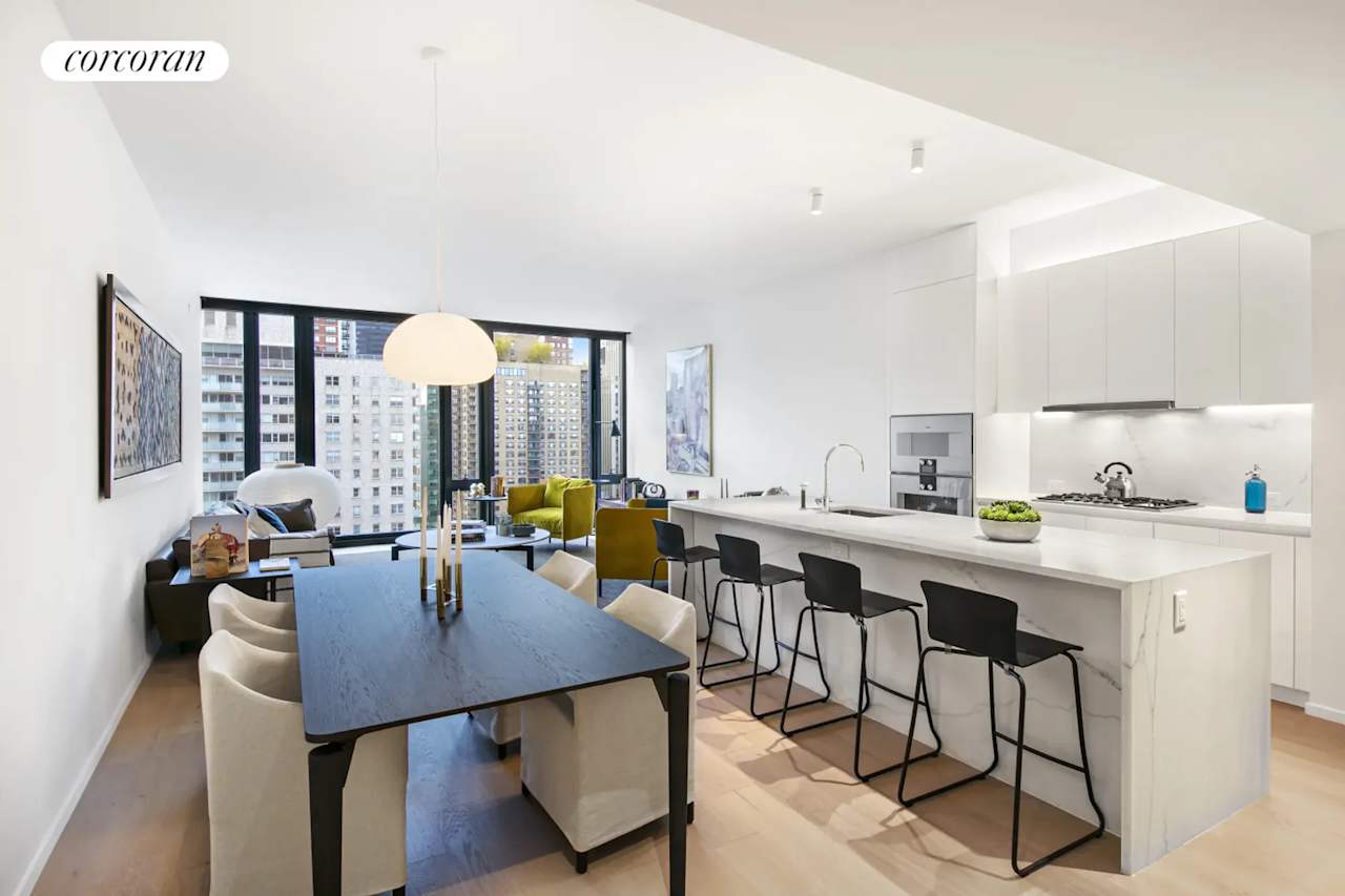 The minimalist aesthetic of 42-story 695 First Avenue, designed by Richard Meier Architects & Partners, matches the dignified atmosphere of the nearby United Nations complex. The extensive amenity package, which includes an East River-facing swimming pool, sunlit children’s playroom, and couch-equipped resident screening room, aims to surpass luxury apartment competition in Murray Hill to the south and Turtle Bay to the north. The prominent building’s upper floors face a spectacular panorama of the Midtown skyline, and every east-facing unit overlooks the waterfront.