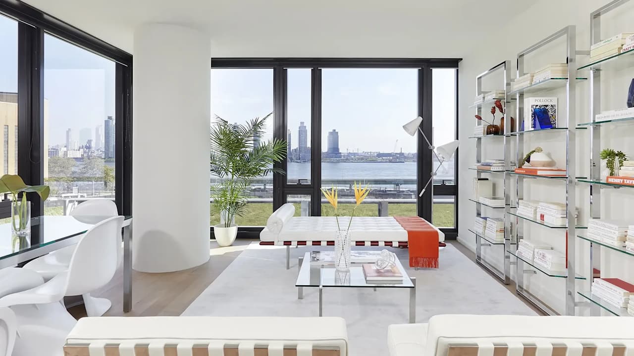 Designed by Meier Partners, the residence interiors are a striking contrast to the black glass exterior, reflecting a white color palette.