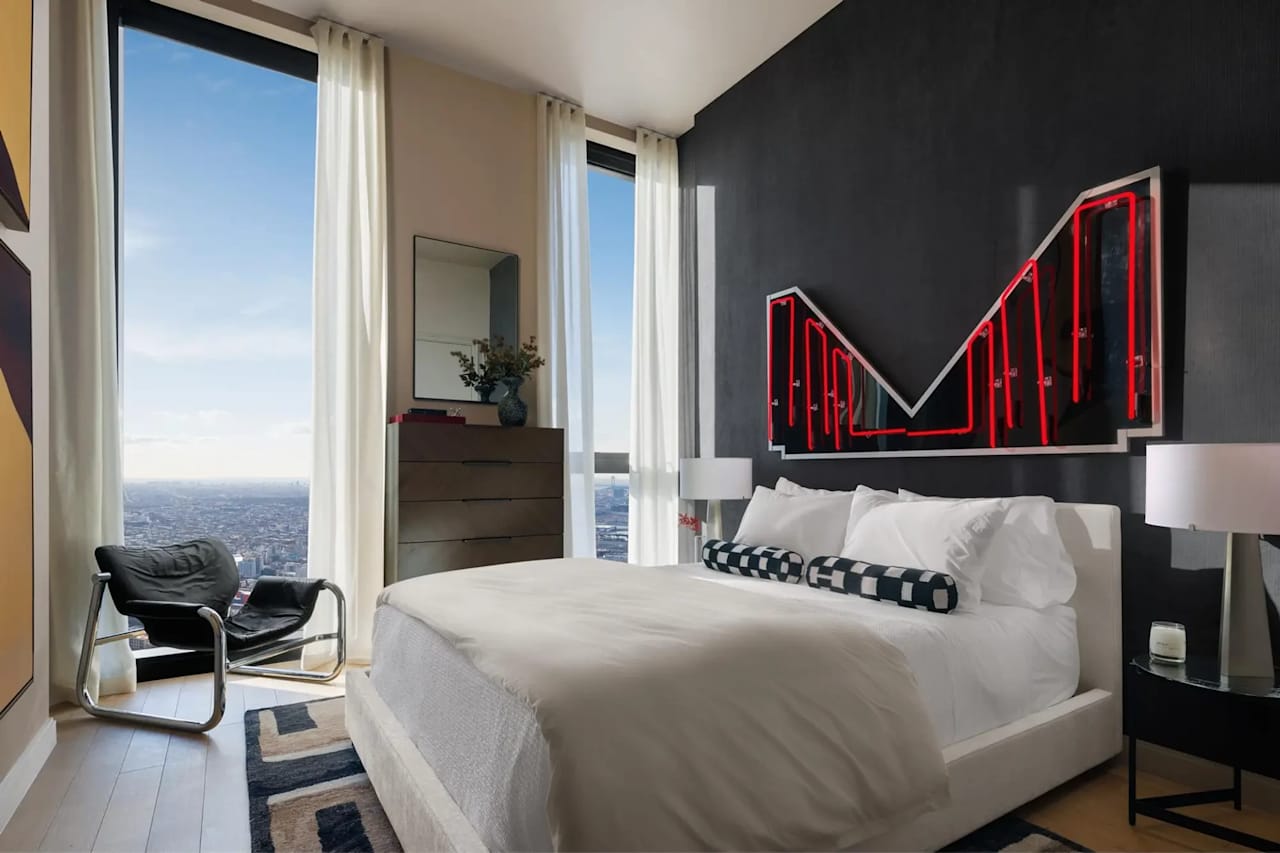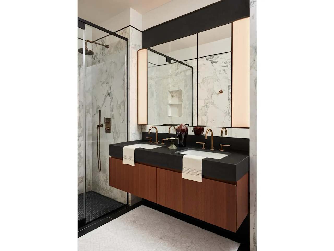 The principal bedroom is afforded the same level of seemingly endless panoramas over Brooklyn, with views of the Verrazzano Bridge and a glistening harbor. Designed for livability, the spacious principal bathroom is elegantly appointed with walls sheathed in expressive Breccia Capria marble and hexagonal flooring designed with a combination of white Bianco Dolomite marble and Absolute Black granite.