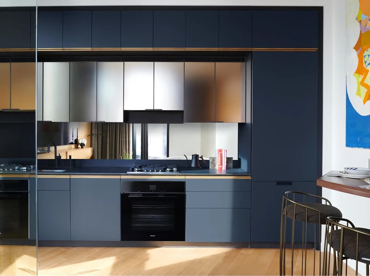 The interior finishes, designed by the prestigious AD100 Gachot Studios, exude quality and sophistication. The open kitchen features graphite matte black and etched bronze mirror cabinetry, a polished bronze mirror backsplash, and Absolute Black granite countertops, along with a fully integrated suite of Miele appliances and Waterworks fixtures.
