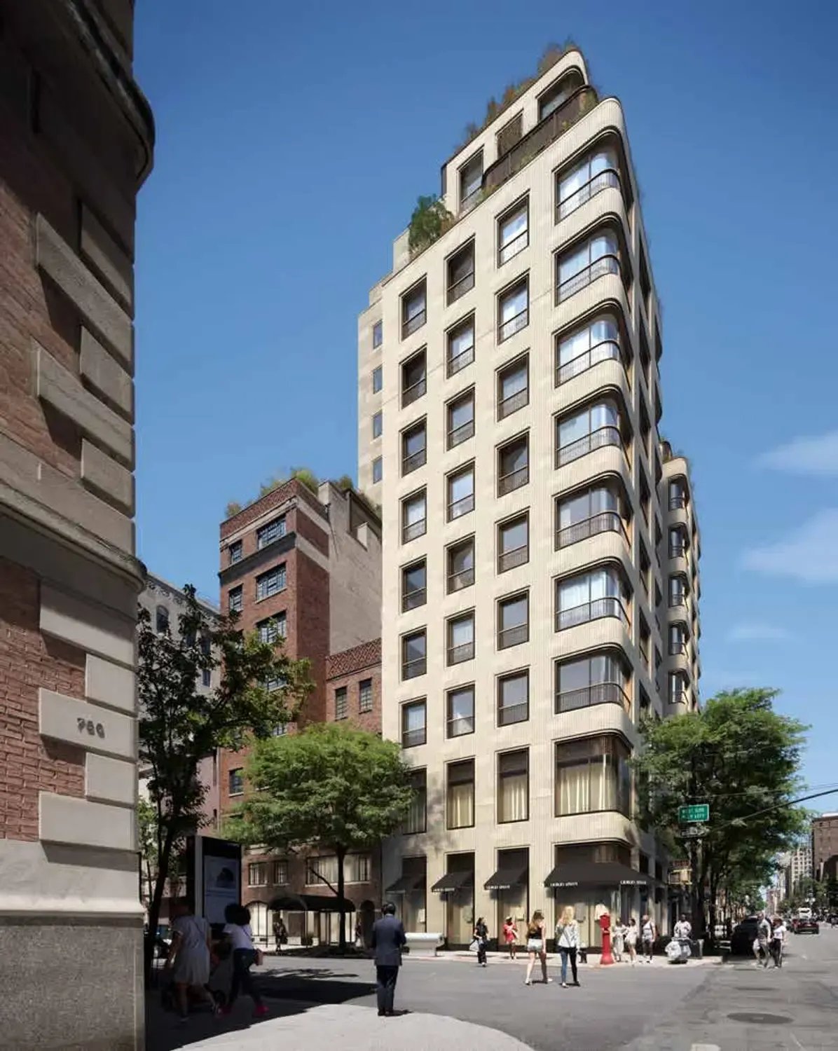 The COOKFOX-designed 760 Madison Avenue draws inspiration from historic Upper East Side architecture and contains 10 luxury condominiums. The housing units start on the second floor, and duplexes start on the fifth floor. Giorgio Armani will design the interiors of the apartments, many of which will feature private terraces. Amenities include a state-of-the-art fitness center, an on-site spa treatment room, a Zen tea room with service from Armani Ristorante, a library and lounge with custom Casa Armani furniture, and an outdoor terrace off the lounge.