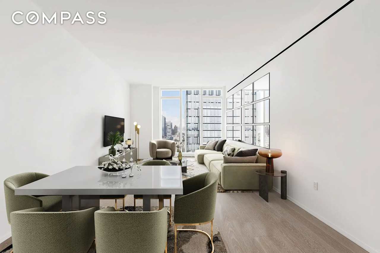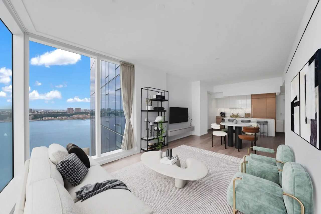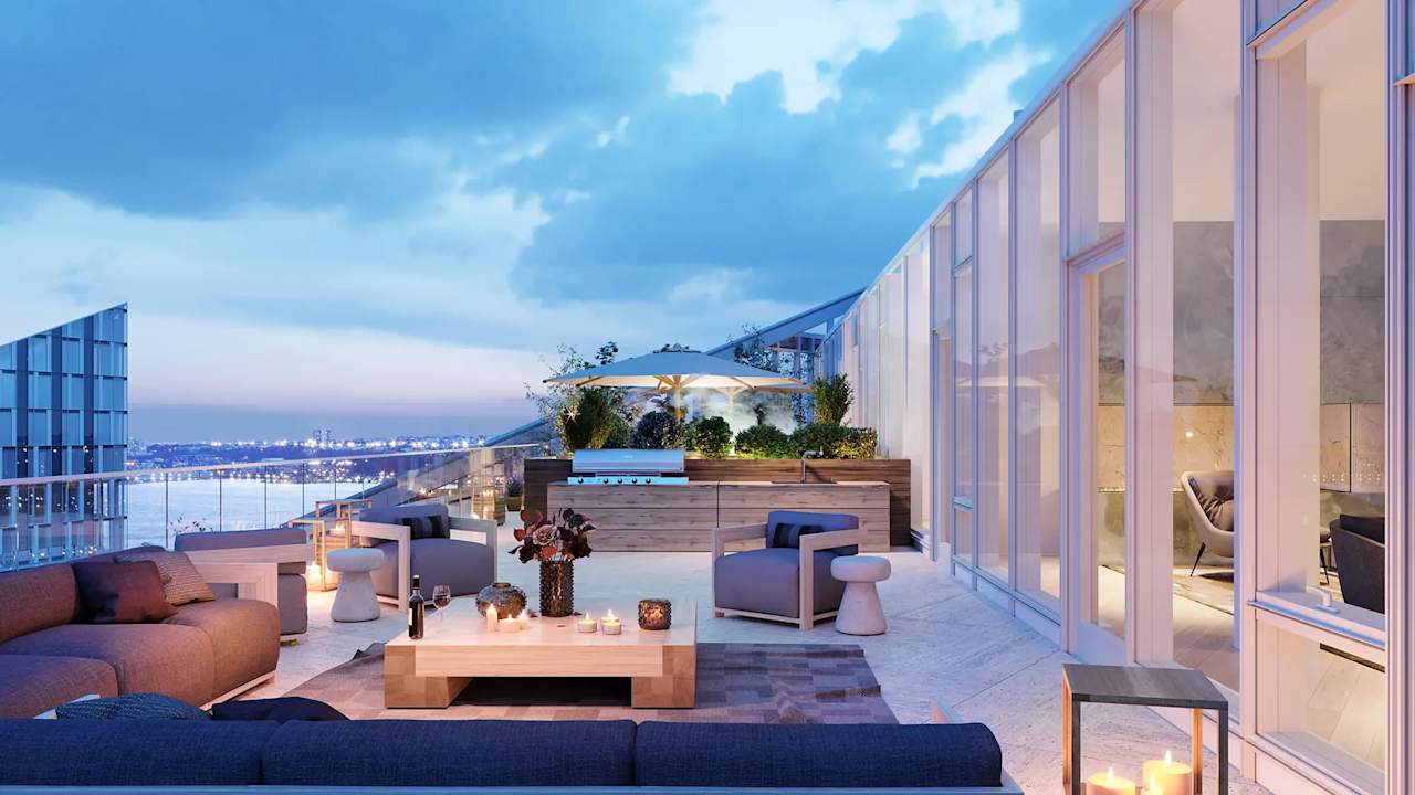 Two Waterline Square has a port-cochere entrance on West 61st Street and a 24/7 on-site parking garage. Other in-house amenities include a private 22-seat dining room with catering kitchen, a salon with media room and billiards table, and a Great Room with double-height ceilings, a fireplace, and access to a landscaped sun deck with BBQ grills and Hudson River views. In addition to the building-exclusive amenities, residents have access to the Waterline Club, a 100,000-square-foot space designed by The Rockwell Group and offering a plethora of fitness, wellness, social, and artistic amenities.